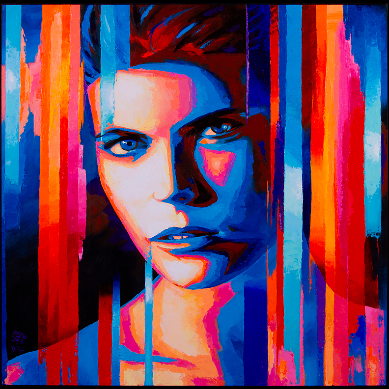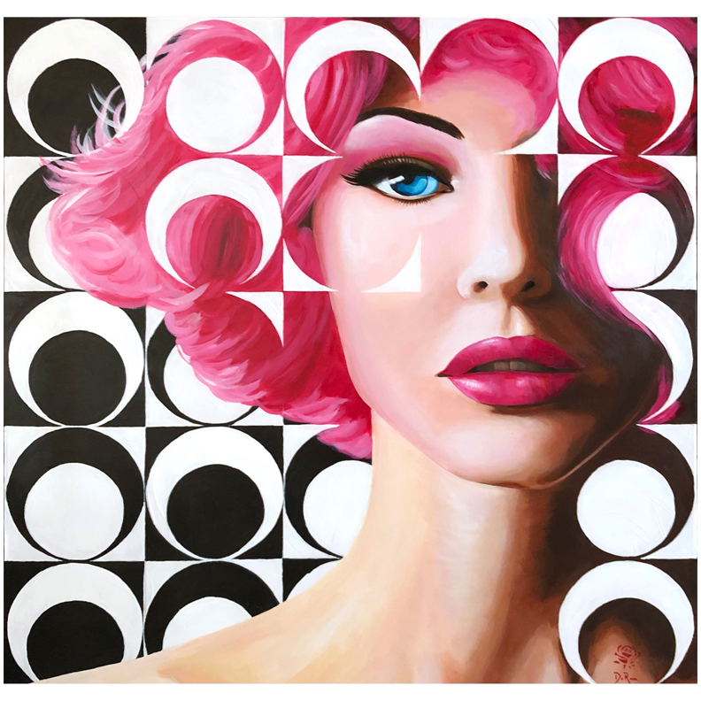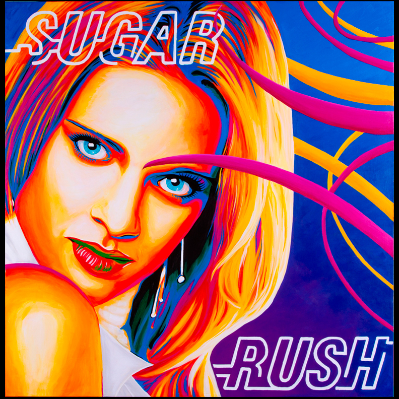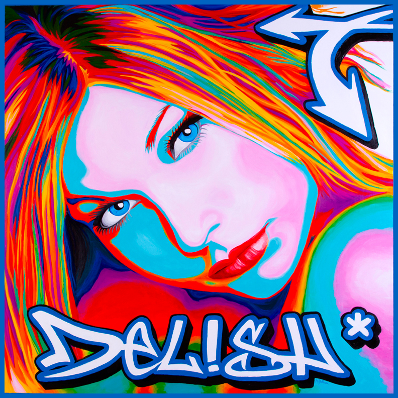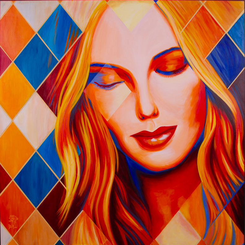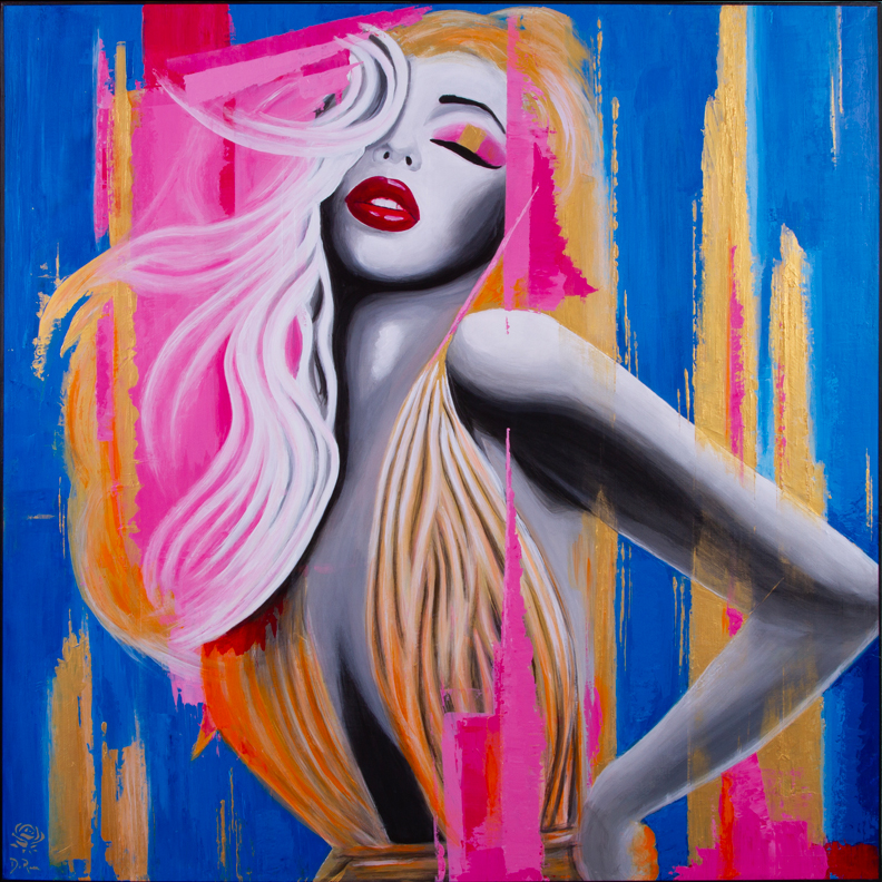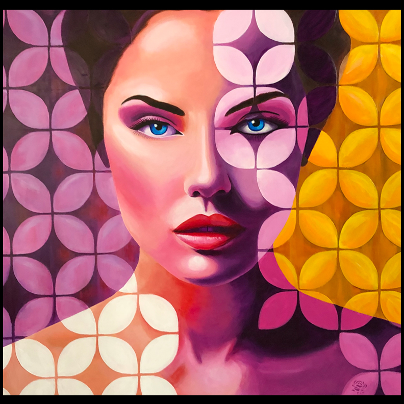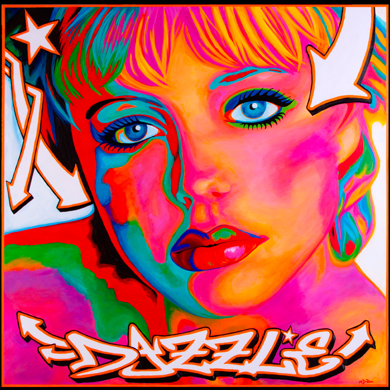 I have picked my images from my original photographs of models that intrigue and inspire me as they emoted in front of my camera (some are from other sources). I will design the artwork in Photoshop and then challenge myself to paint it. Usually, when I start a work it can take me a few days to a week before I start painting while I develop the concept and adjust the colors and composition until I feel satisfied. While constructing the image in Photoshop I digitally enhance the color, add special effects, and Graphic design elements of lettering and shapes to create a mood and theme. I cut out my own stencils and paper collage elements and begin to translate and adapt and combine with paint on the canvas. Which is when the magic happens!