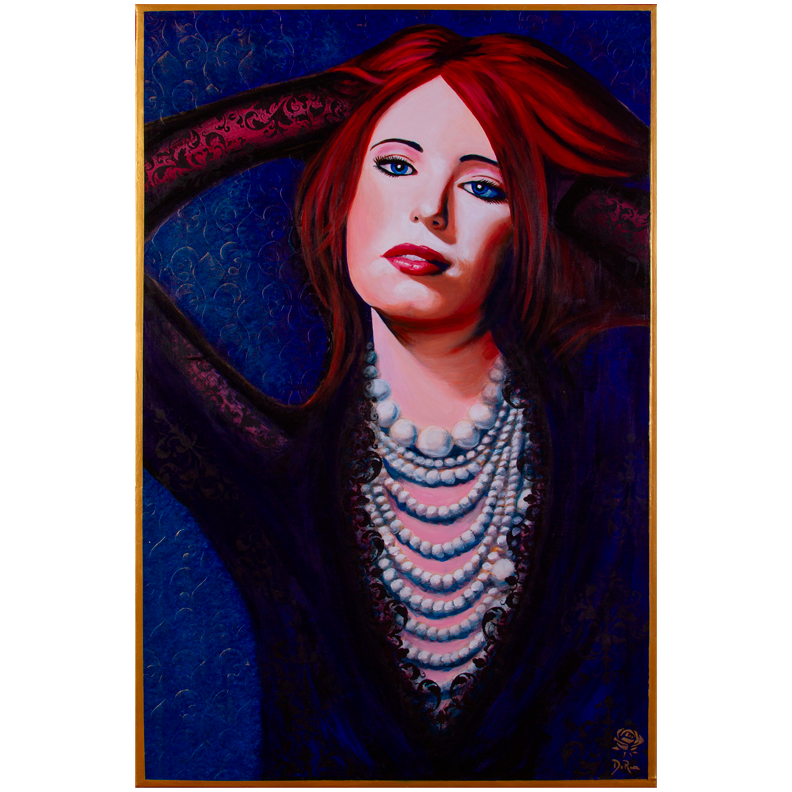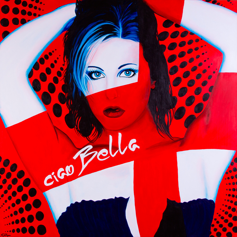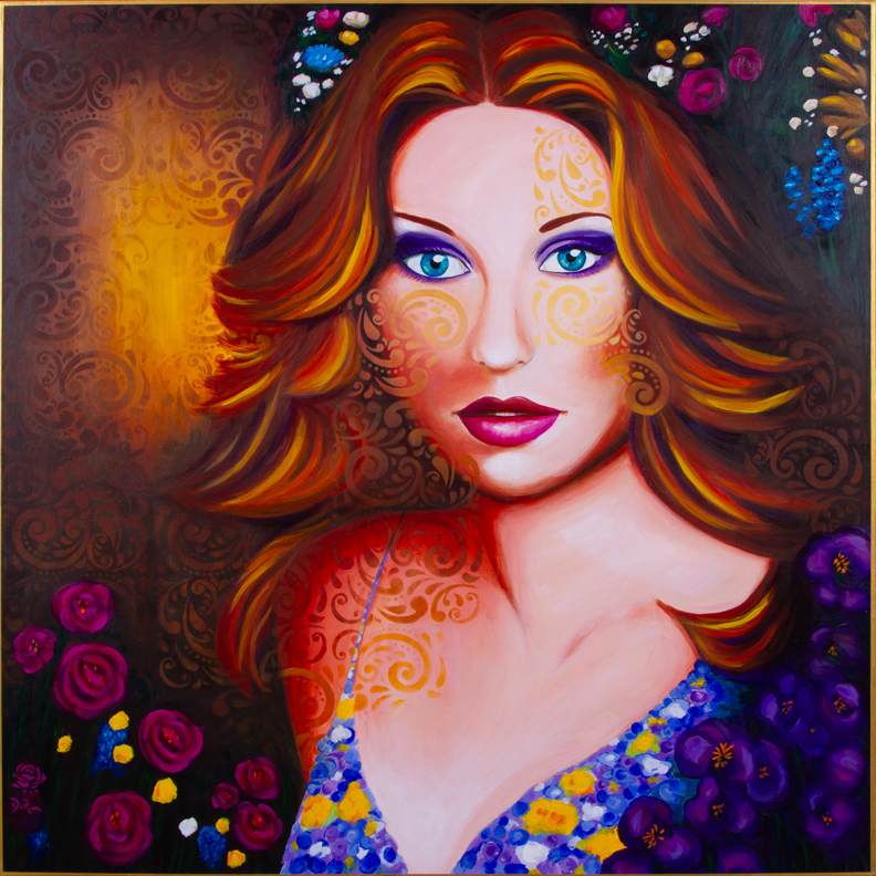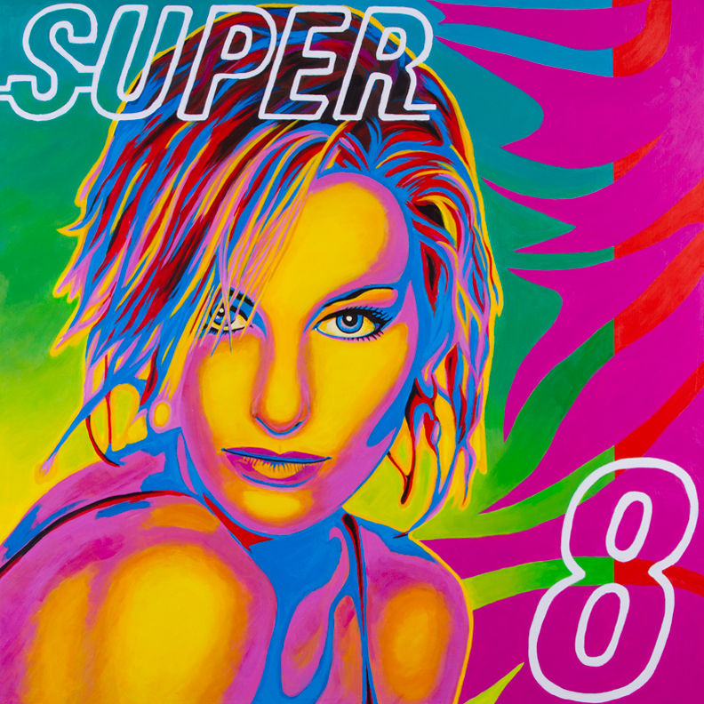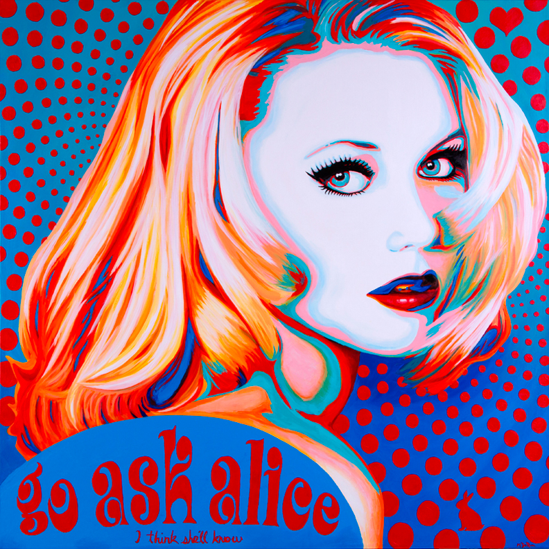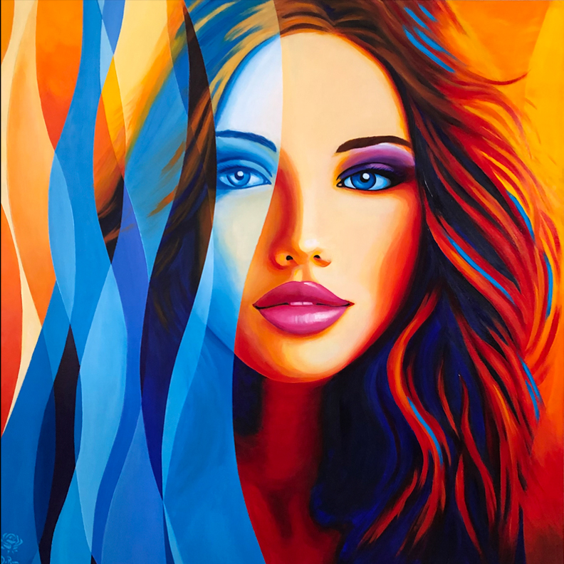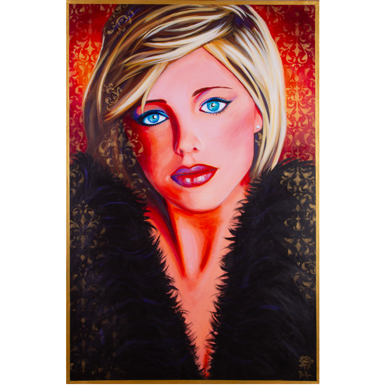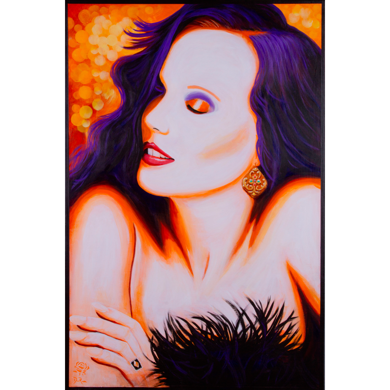 I have picked my images from my original photographs of models that intrigue and inspire me as they emoted in front of my camera (some are from other sources). I will design the artwork in Photoshop and then challenge myself to paint it. Usually, when I start a work it can take me a few days to a week before I start painting while I develop the concept and adjust the colors and composition until I feel satisfied. While constructing the image in Photoshop I digitally enhance the color, add special effects, and Graphic design elements of lettering and shapes to create a mood and theme. I cut out my own stencils and paper collage elements and begin to translate and adapt and combine with paint on the canvas. Which is when the magic happens!